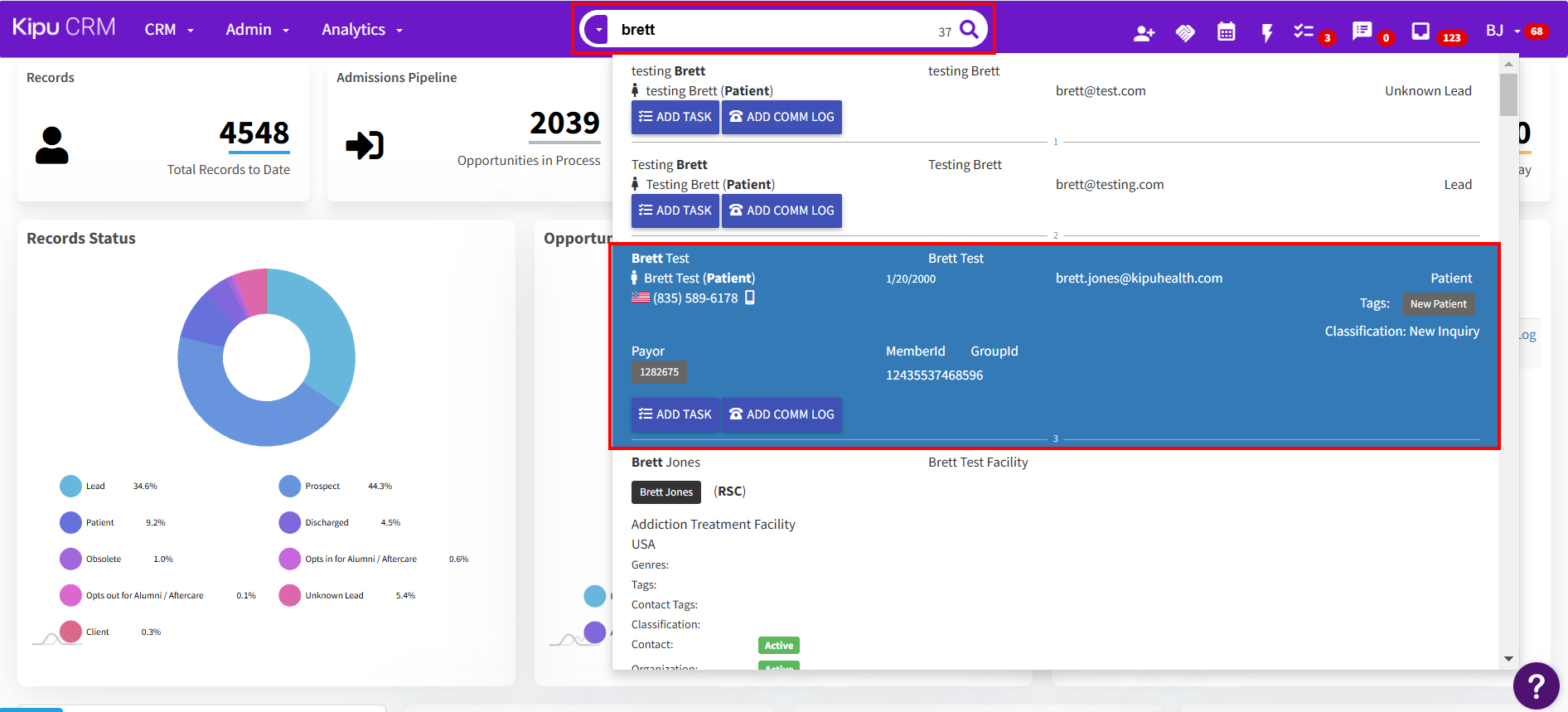Using the Global Search Bar, search for your desired prospect/patient record and select them from the search results.