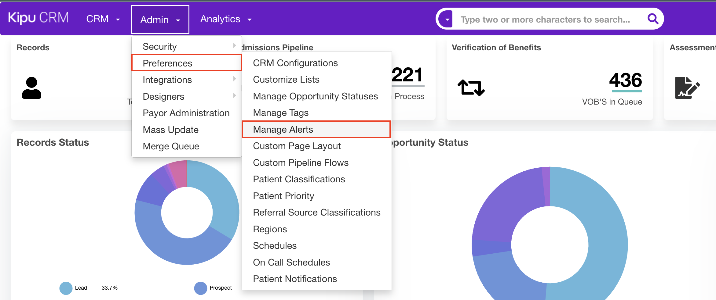 - Navigate to Admin> Preferences > Manage Alerts.