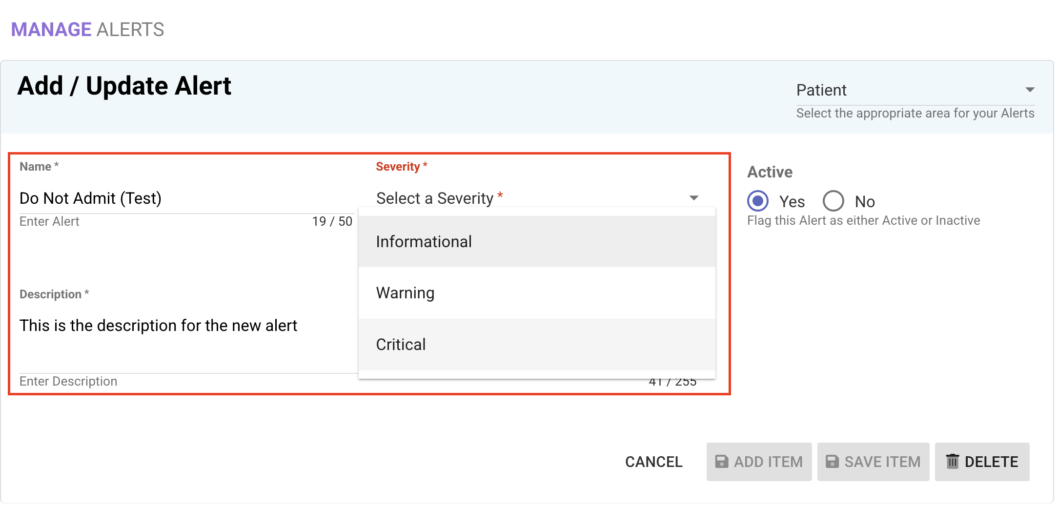 - Add a Name, Severity Level, and Description for the alert, then select Save Item.