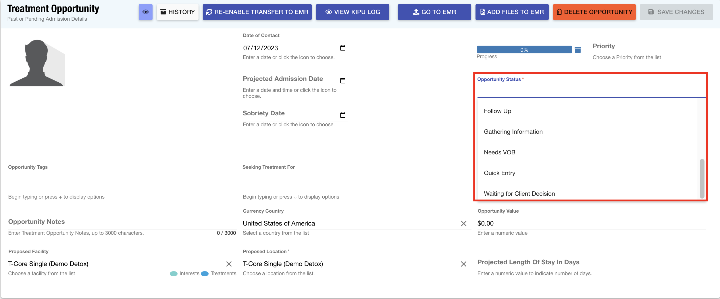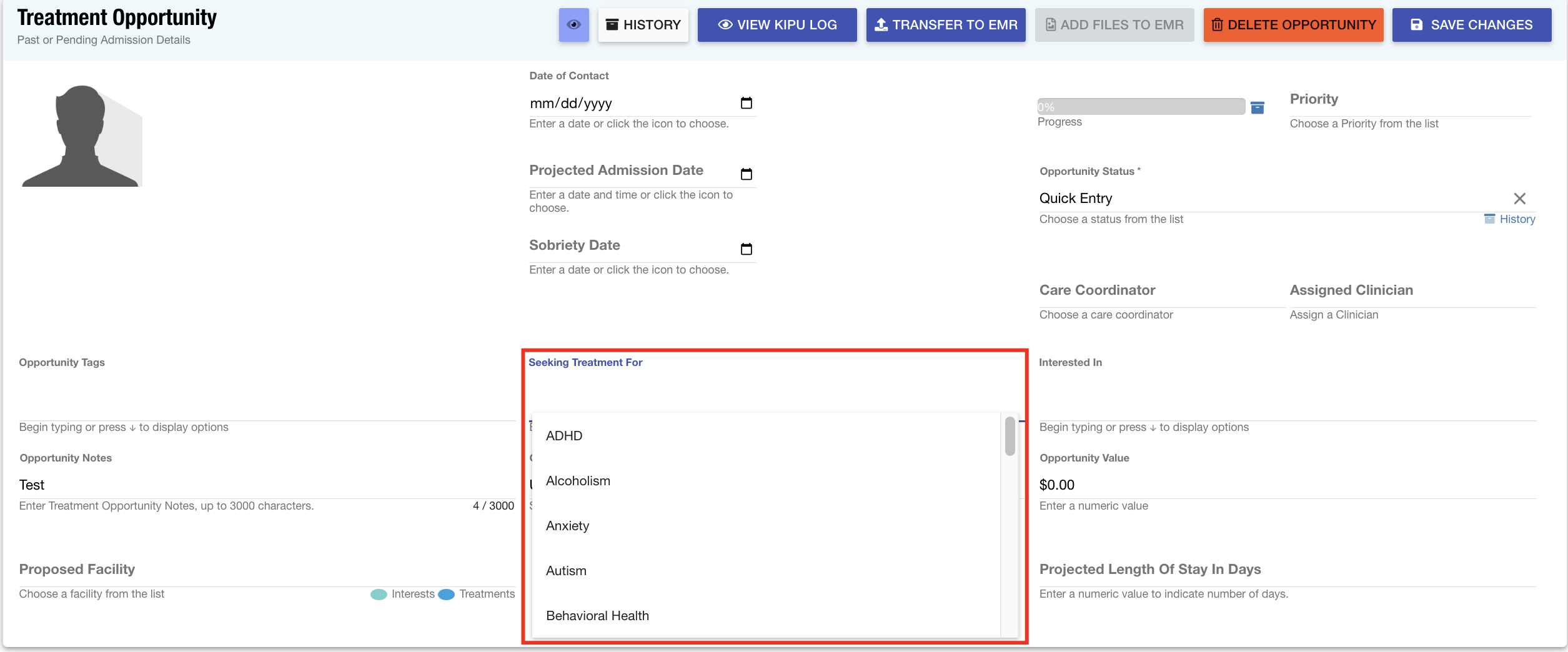 Seeking Treatment For: Upon adding an opportunity to a client record, the admissions staff has the capability to document the conditions for which the client is seeking treatment. This list outlines the general health condition that the prospect aims to address.