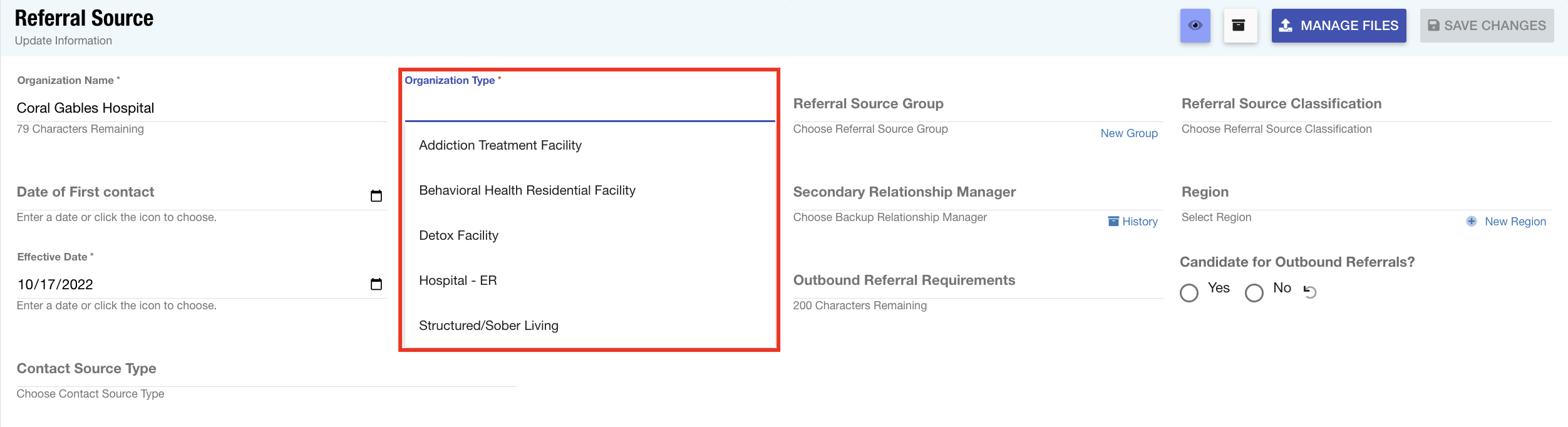 Types of Care: When documenting referral sources in the system, users can specify the exact services that the organization can offer to patients. These values are searchable within the system so users can quickly identify qualifiable outbound referral source candidates.