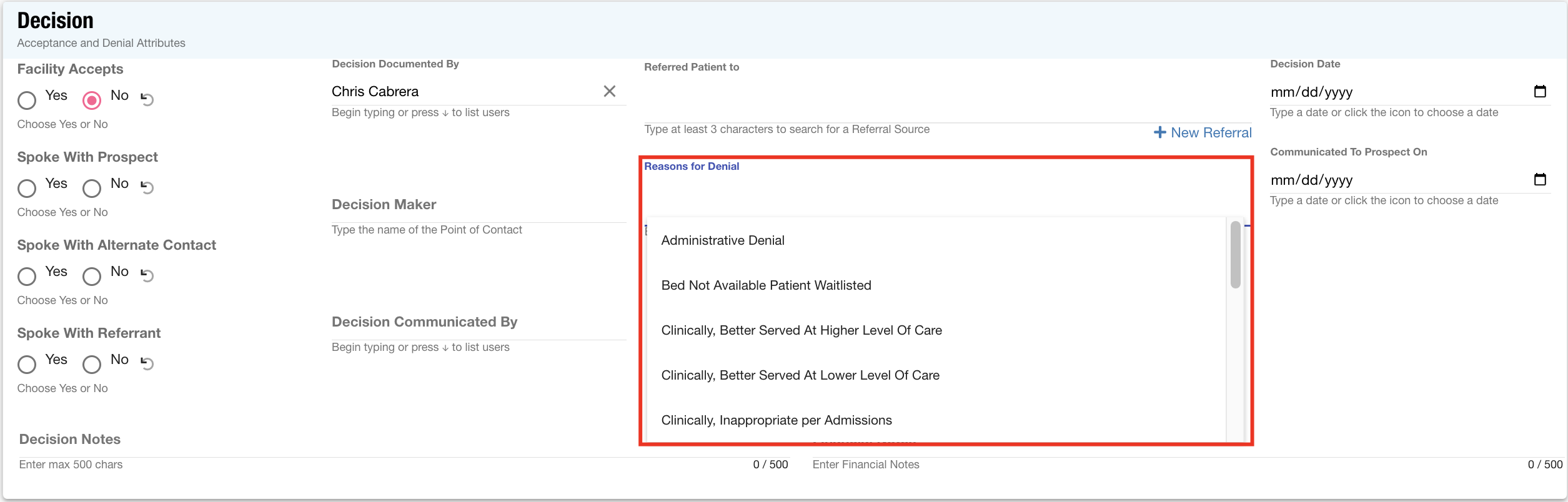 Denial Criteria: After adding an opportunity to a client record and working it through your admissions process, a decision is made. If denying the client, the CRM allows you to indicate why so you can track common reasons you deny an admission.