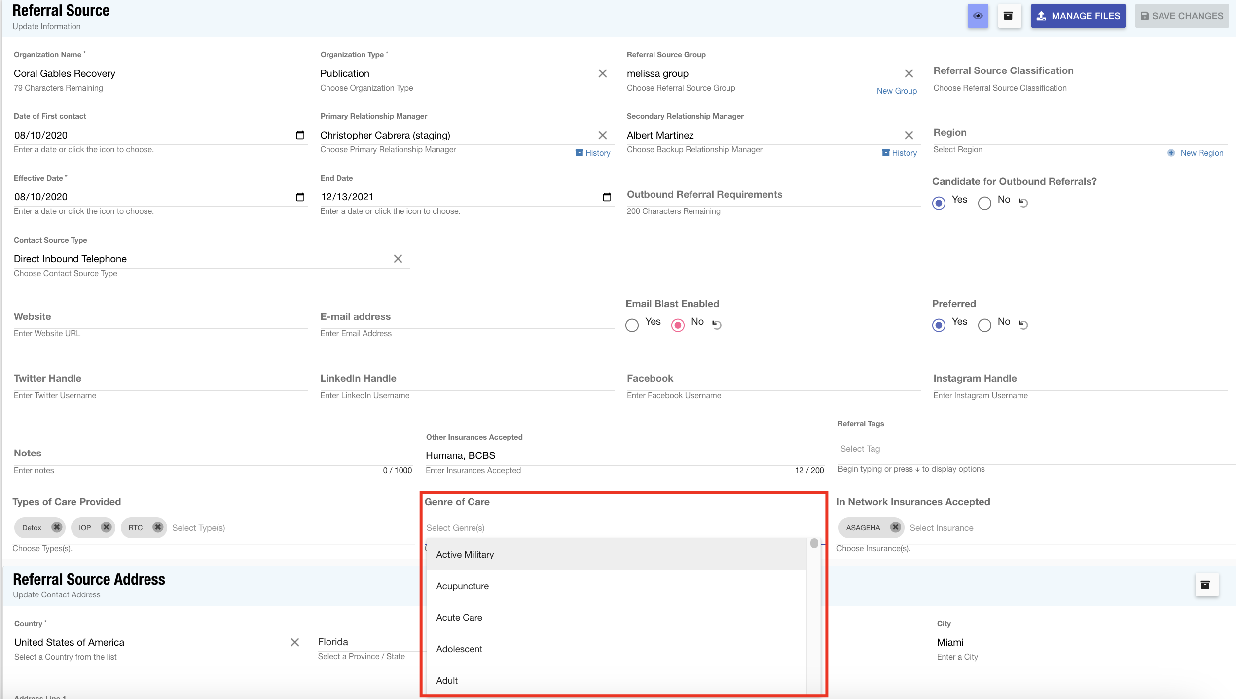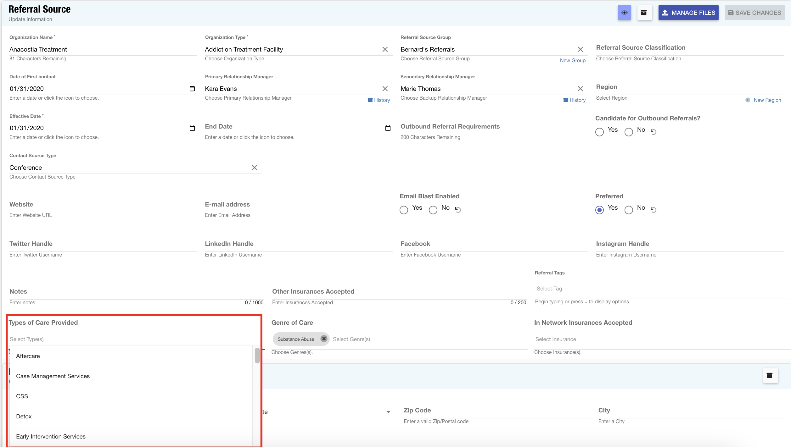 Genre of Care: When a user establishes a referral source, the genre of care field is utilized to specify the particular areas in which an organization holds expertise. These attributes are searchable criteria. The list offers a range of options and can be customized to avoid sifting through an extensive catalog.