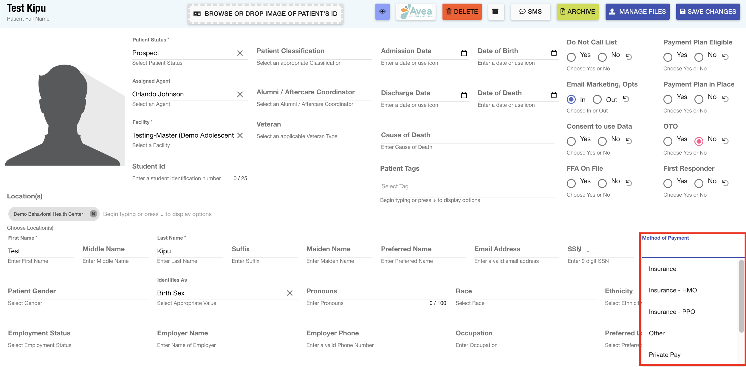 Method of Payment: When processing patient records, users can specify the exact payment method the client will be leveraging to pay for their treatment services. Super Users can customize this list to ensure only the applicable payment options appear for selection to streamline the documentation process.