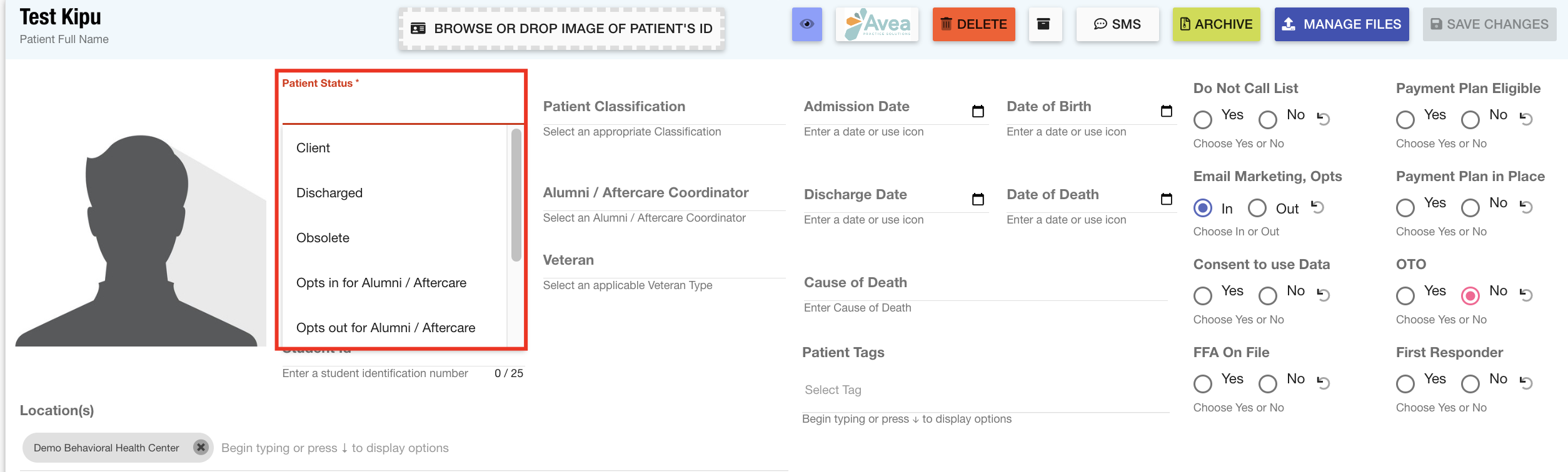 Patient Status: The Patient status field is used to classify the current state of the client as it relates to your organization. Common statuses used are prospect, patient, and discharged.