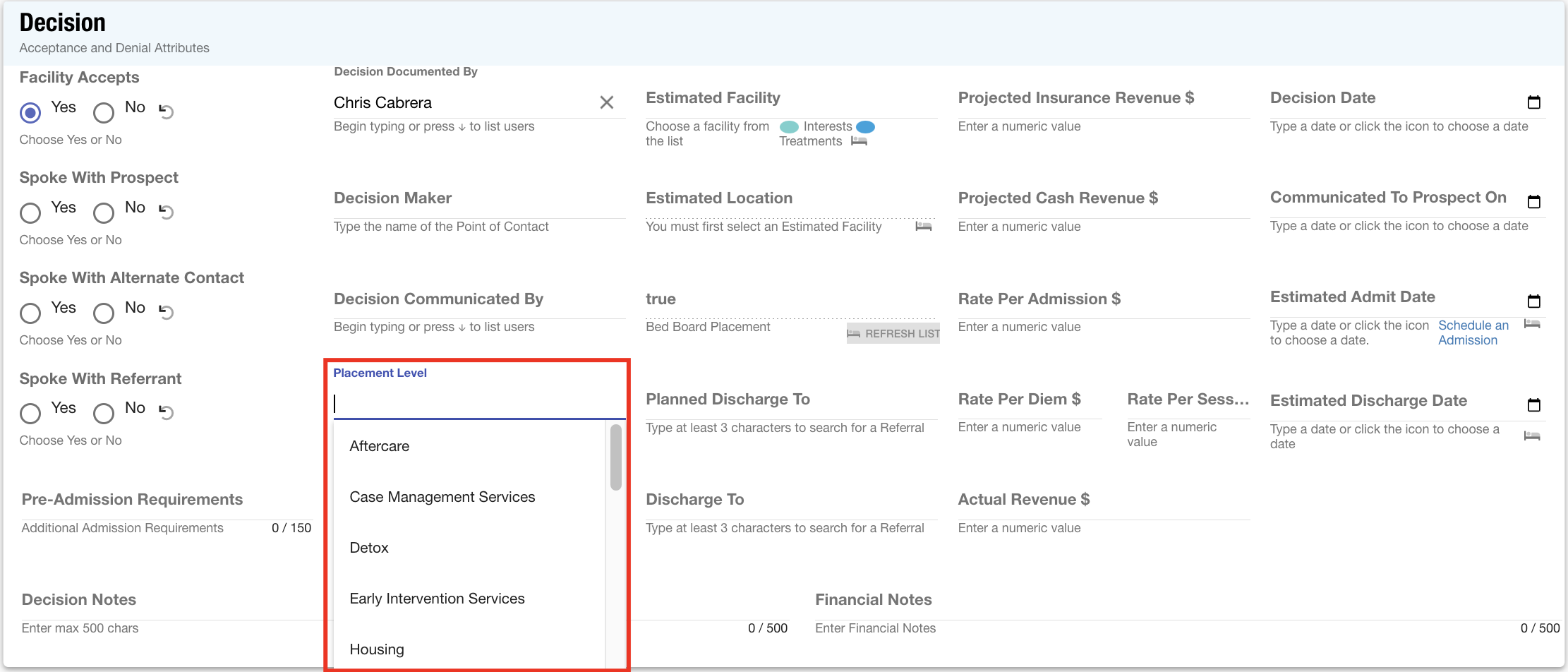 Placement Level: When documenting a final decision on treatment opportunities, users can specify the specific level of care that the patient will be admitted into. Adjusting this to match your facility offerings will ensure accurate documentation within the system.