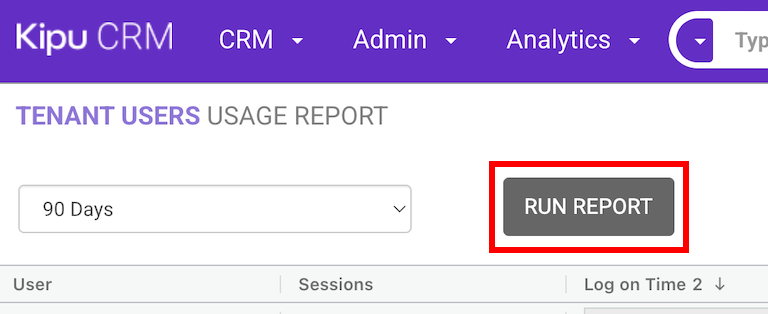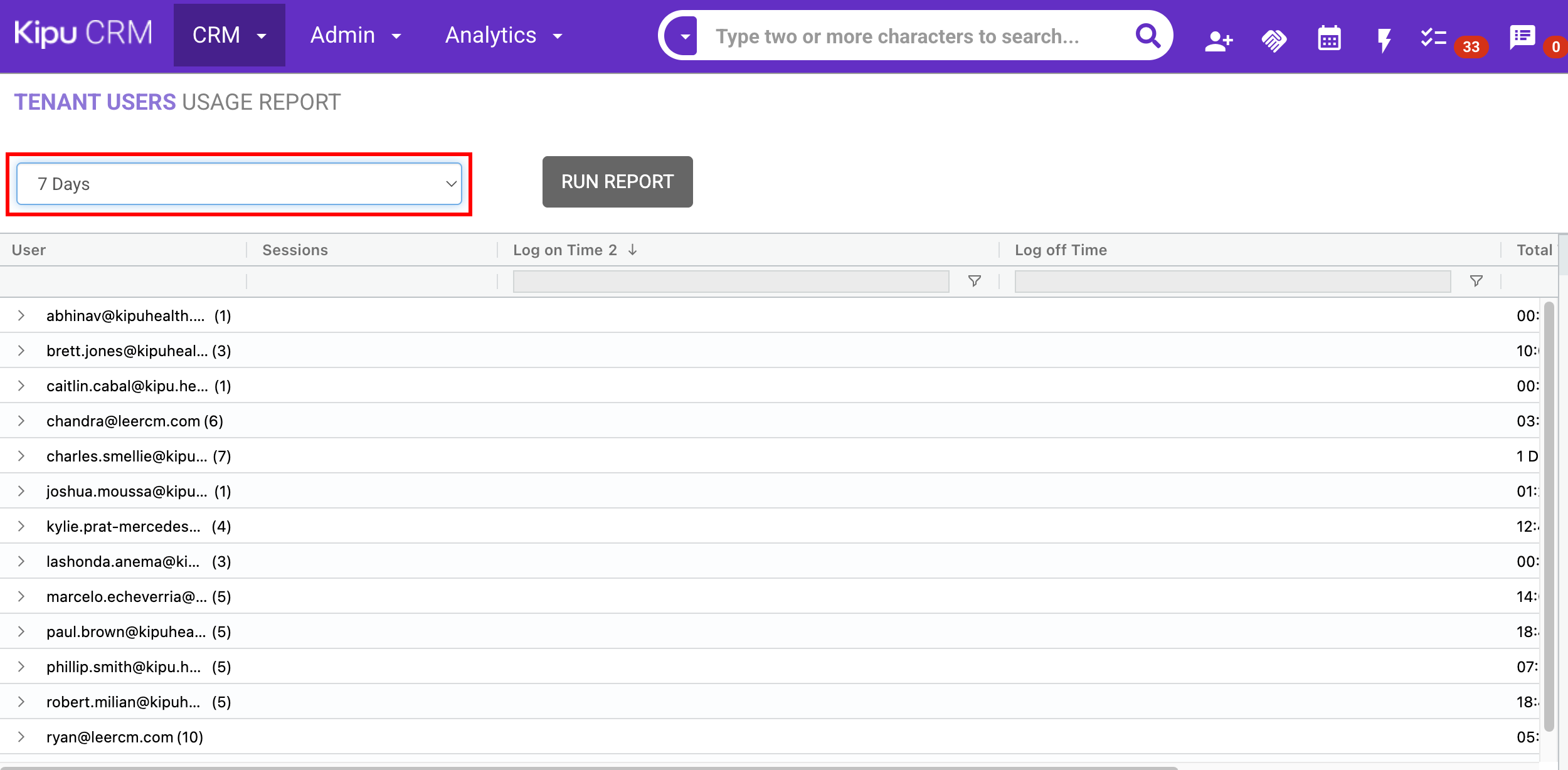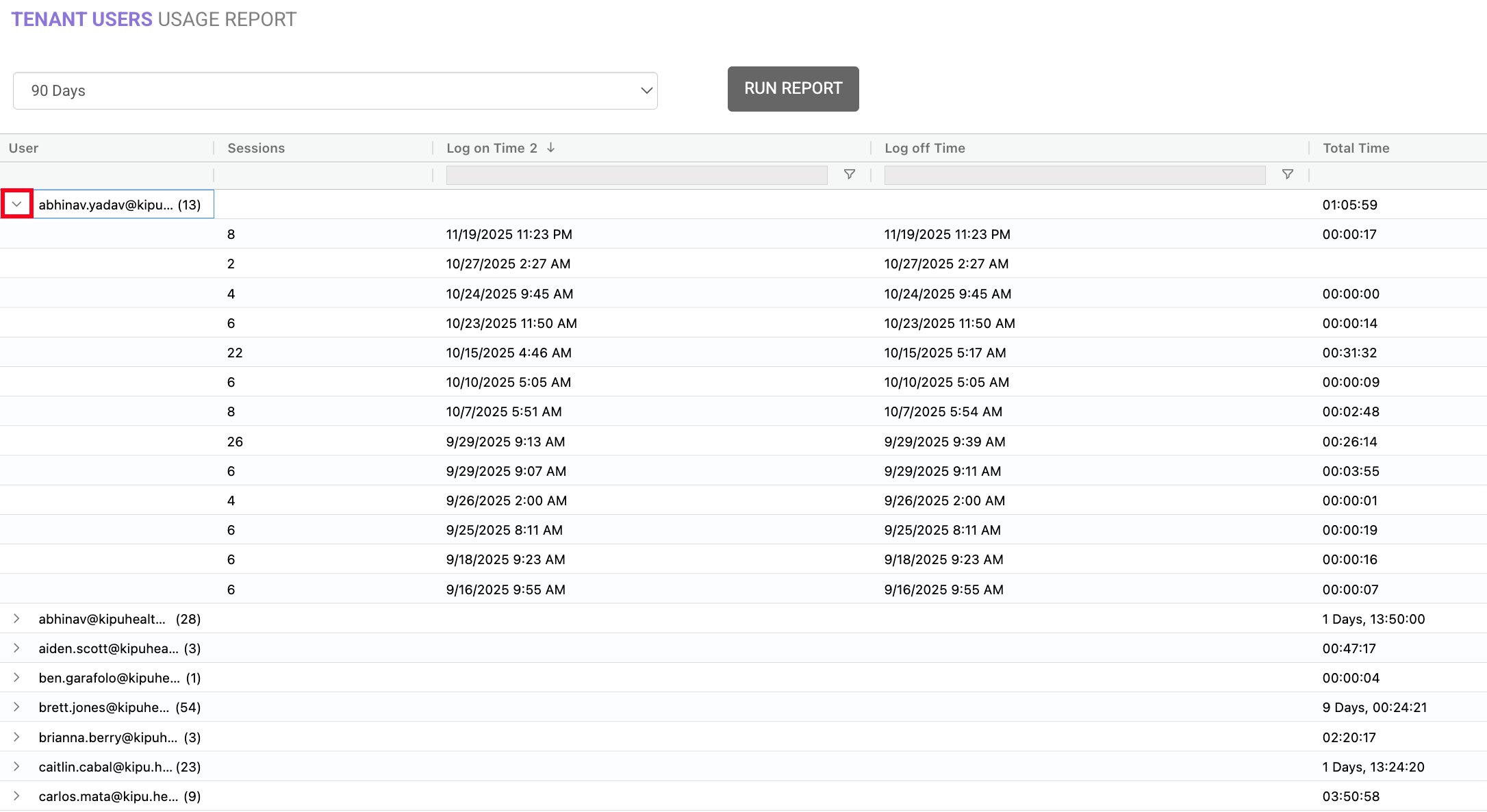 The Tenant Users Usage Report in the Kipu CRM provides Super Users with a comprehensive view of all user activity. It includes the number of user sessions, login and logout timestamps, and total time calculations. A session is defined as any system process initiated as a result of a user’s interaction with the CRM.