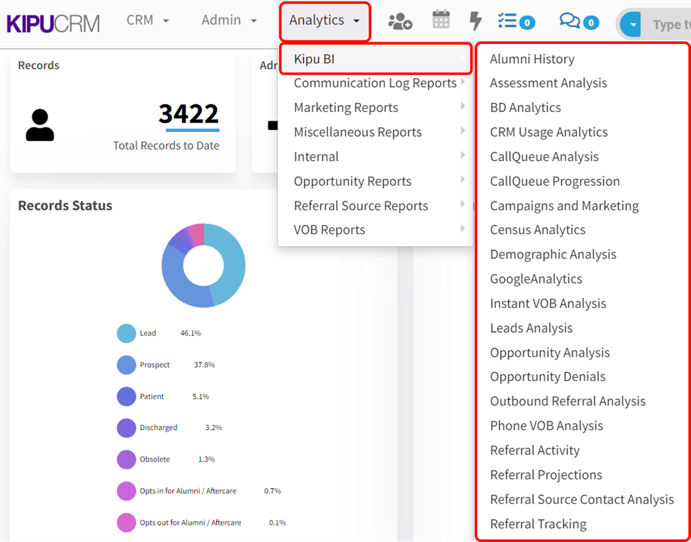 The CRM offers a variety of reports under our In-House Reporting and BI Dashboards which provide analytics on admissions, referrals, marketing efforts, VOBs, and more. To find these reports, users will click on Analytics and select the desired in-house report or Kipu BI dashboard.