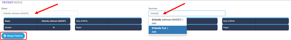 Within Patient Merge, search for the Ghost file and the Survivor file.