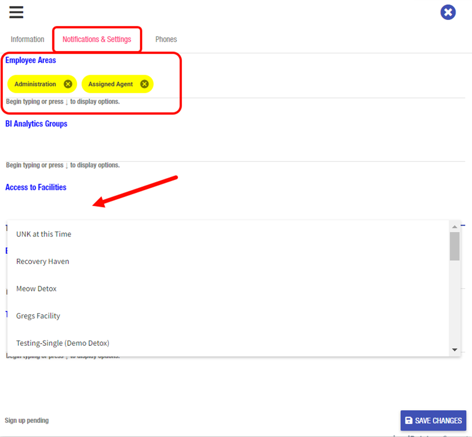 Under Employee Areas, begin typing or click to display options.